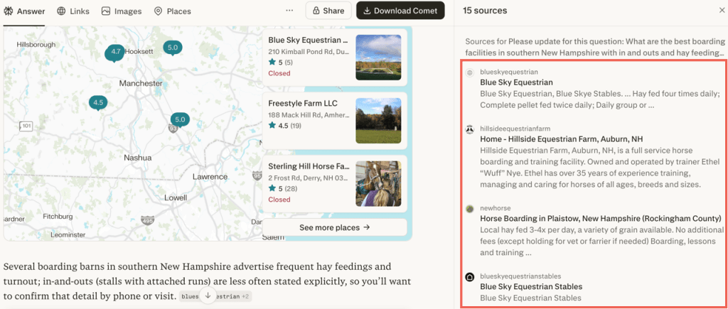 They were using Perplexity to ask: “What are the best boarding facilities in central Massachusetts with daily turnout and quality hay programs?”