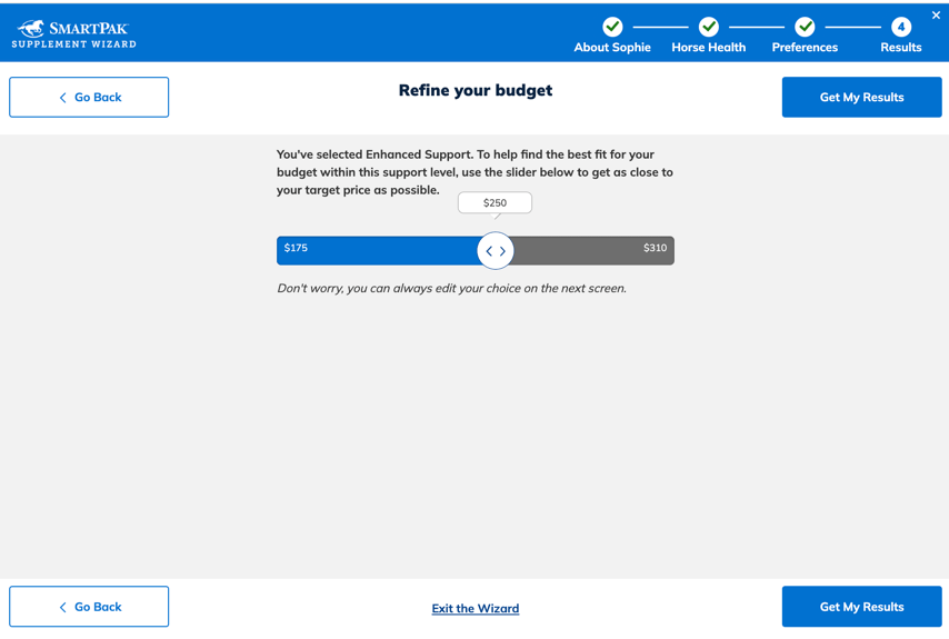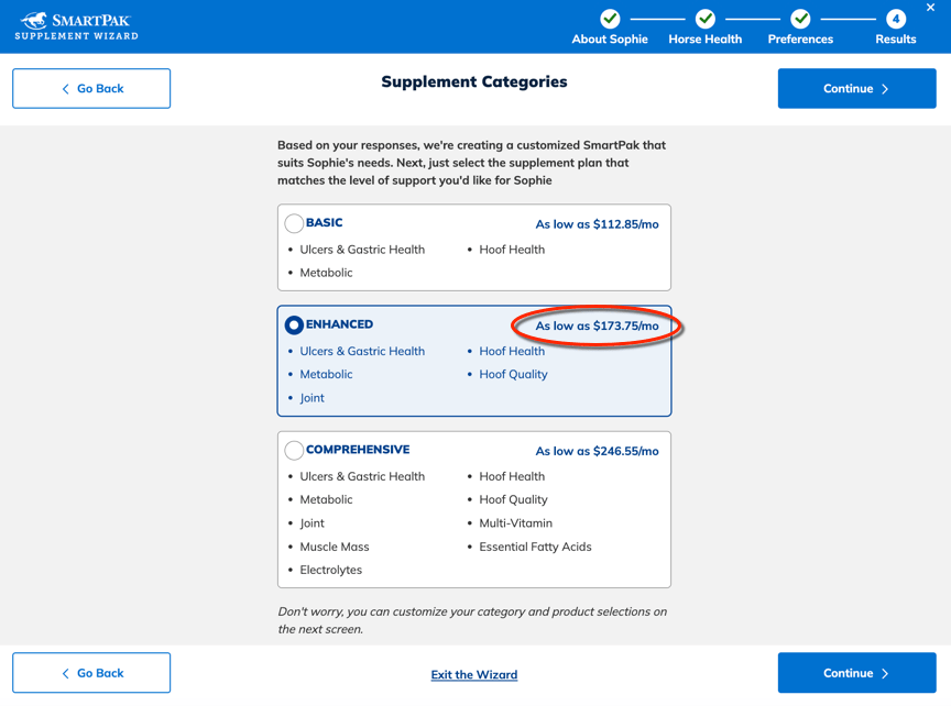 Problem: The Supplement Wizard is a health and lifestyle survey that helps customers narrow down the hundreds of supplements to choose from to build the best supplement regime for their horse. Customers told us they didn’t like being shamed if they couldn’t afford the expensive supplement programs the survey consistently returned.