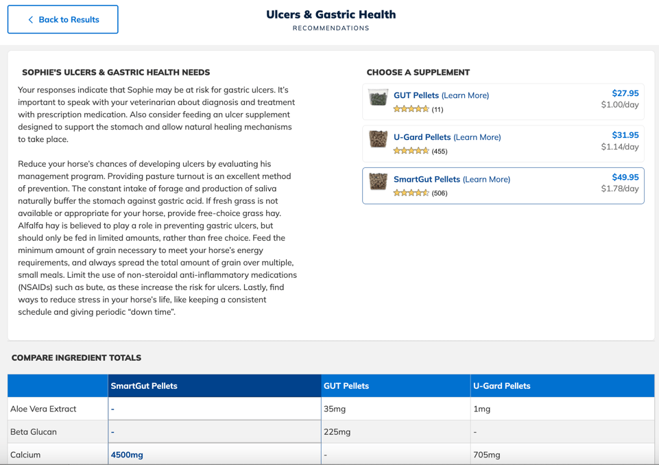 Solution: Give customers more freedom to customize their results and build the perfect supplement program for their horse. This meant a fully redesigned customer experience with a budget slider and more flexibility to pick and choose which categories and tiers of supplements they wanted to use.